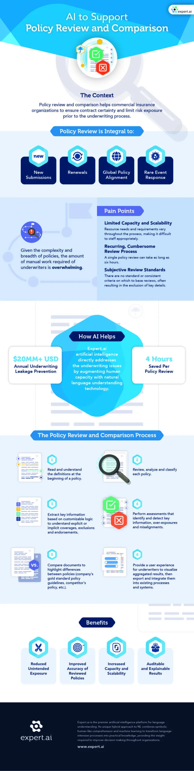 Unfortunately, there is nothing easy or expeditious about reviewing an insurance policy. With policies often topping 100 pages of dense, textual information, it can take several hours for a single person to complete one thorough policy review. Insurers are all too familiar with this painful inefficiency, as policy reviews are performed quite frequently, including: