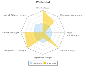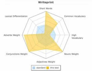 President Biden, though only speaking for five minutes longer than President Trump, spoke nearly 800 words more (2,411 vs. 1,433) than his predecessor. What is interesting is that Biden spoke in slightly shorter sentences (15 words per sentence vs. 17 words per sentence) than President Trump. This is clearly borne out in the Writeprint analysis (below) that shows Biden’s minimal use of adjectives compared to the heavy use of them by President Trump.