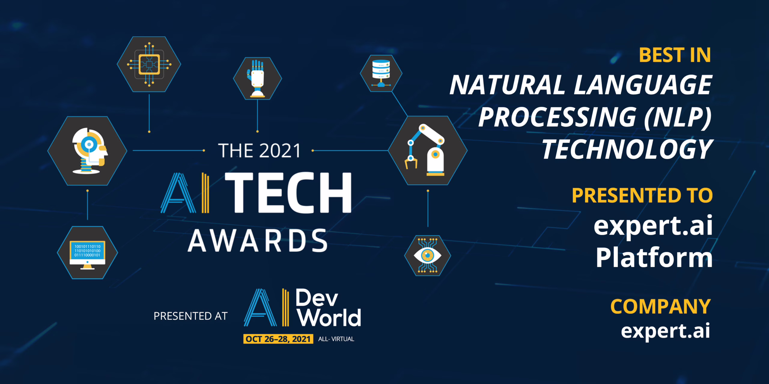 Expert.ai comunica que su plataforma NL híbrida ha recibido el premio a la Mejor tecnología de procesamiento del lenguaje natural en los AI TechAwards 2021. Este prestigioso galardón reconoce la innovación, la recepción y adopción de la tecnología en la industria de la inteligencia artificial, el aprendizaje automático y la ciencia de los datos, y su uso por parte de la comunidad de desarrollo.